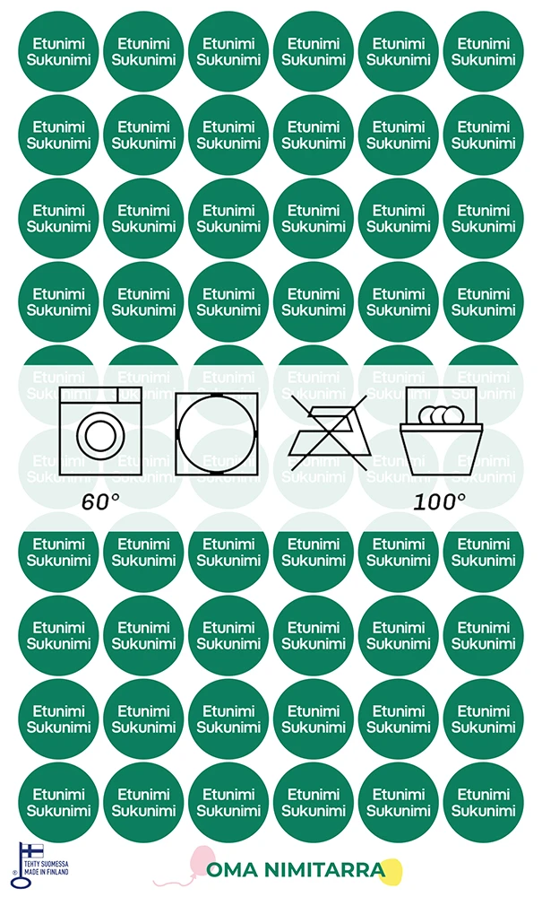 Ympyrän muotoinen pesunkestävä tarra (⌀18mm) sopii hyvin vaatteiden pesulappuihin. Nimikointitarrat soveltuvat lähes kaikenlaisten vaatteiden, tavaroiden, lelujen, astioiden nimikoimiseen ja merkitsemiseen.