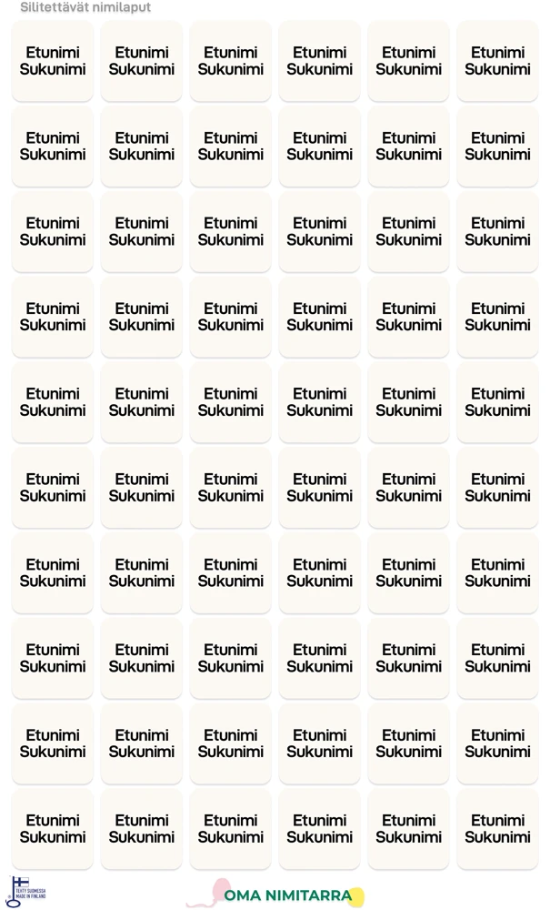 Tarra-arkissa on 60 nimitarraa. Ostamalla useamman arkin säästät - 1 arkki 15€ 60kpl, 2 arkkia 20€ 120 kpl ja 3 arkkia 25€ 180 kpl. Arkit voivat olla erilaisia (muoto, väri ja nimi). Hintaan lisätään toimituskulu 2,90€