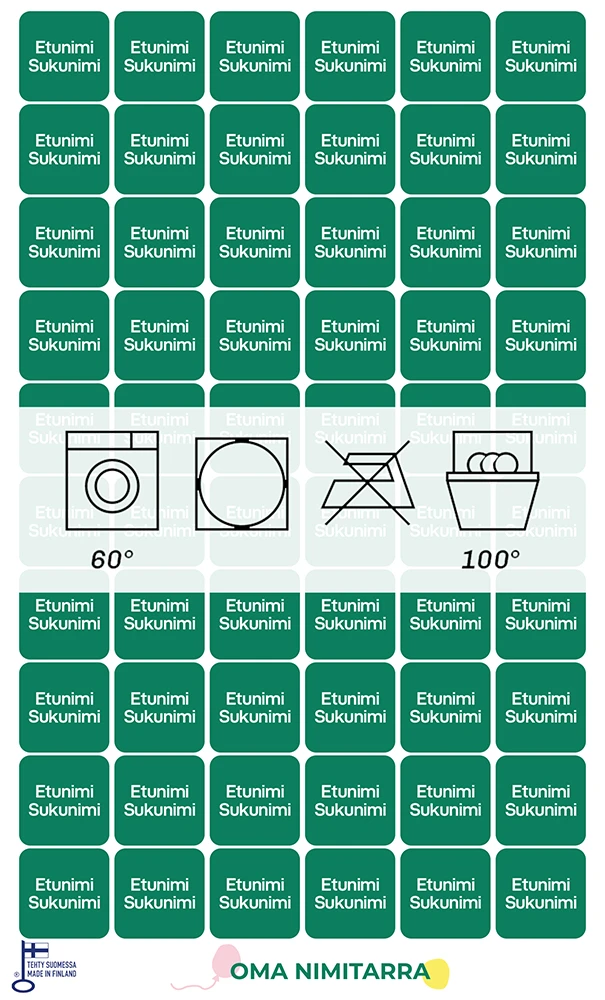 Tavaroissa ja asusteissa joissa ei ole pesulappua, tarra pysyy parhaiten kiinni tasaisella ja puhdistetulla pinnalla. Anna tarran kiinnittyä 24 tunnin ajan ennen pesua.