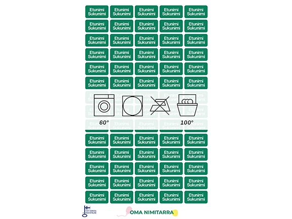 Suorakulmion muotoiselle pesunkestävälle tarralle (22x12mm) mahtuu pidempikin nimi. Nimikointitarrat soveltuvat hyvin vaatteiden, tavaroiden, lelujen, astioiden ja kenkien nimikoimiseen ja merkitsemiseen.